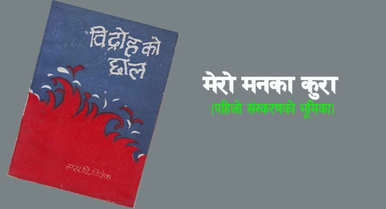 (पहिलो संस्करणको भूमिका) मेरो भन्नु केही छैन । जे छ यहाँहरूको मात्र छ । मैले त केवल एउटा गन्थन कोरेँ । मात्र गन्थन । गन्थनमा अलि राम्रोसँग कलात्मक तालमेल मिलाउन सकिनँ । भत्केको घर सजिलैसँग मेसो पर्दोरहेनछ । देशको अन्याय, अत्याचार, दमन र उत्पीडन अनि यहाँको आर्थिक अवस्था, छोटकरीमा भन्दा सिङ्गो नेपाल र नेपालीकोे यथार्थता … Continue reading मेरो मनका कुरा