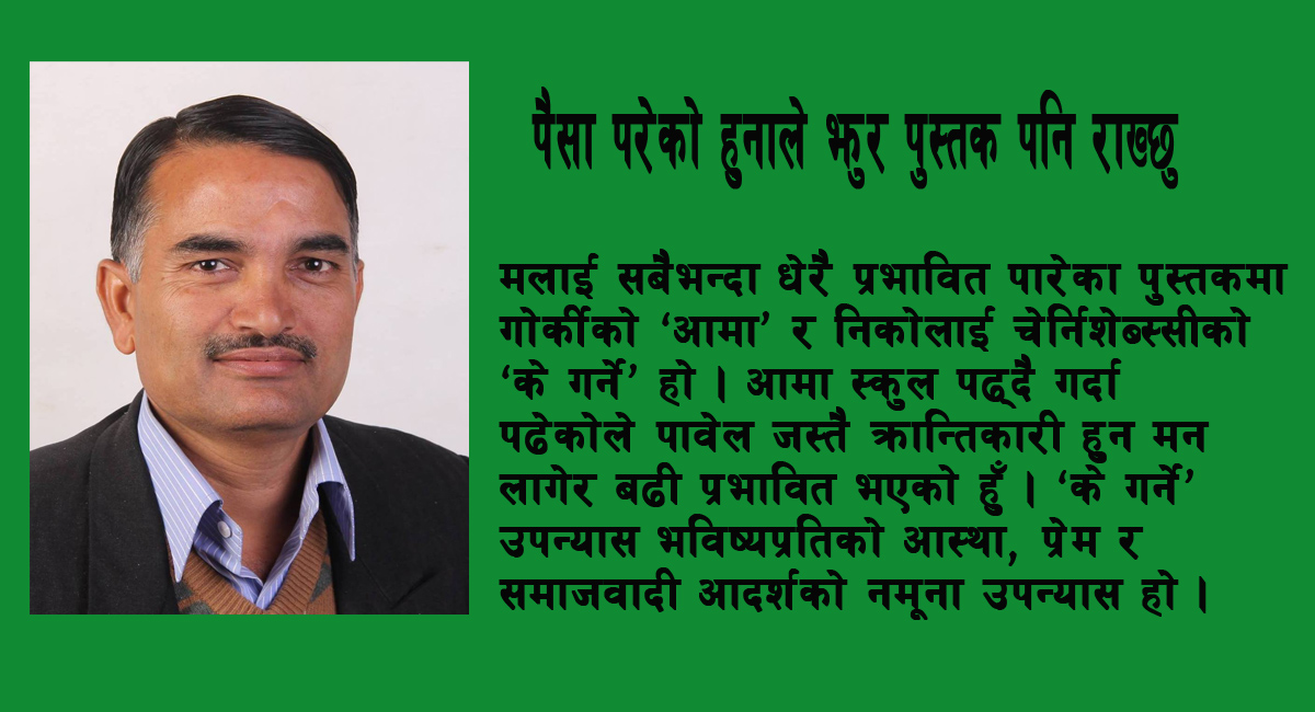 मलाई अहिलेसम्म प्रभावित गरेका धेरै पुस्तक छन् । तीमध्ये सबैभन्दा धेरै प्रभावित पारेका पुस्तकमा म्याक्सिम गोर्कीको ‘आमा’ र निकोलाई चेर्निशेब्स्सीको ‘के गर्ने’ हो ।