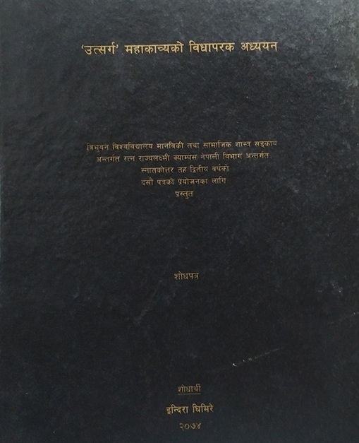 त्रिभुवन विश्वविद्यालय, मानविकी तथा सामाजिक शास्त्र सङ्काय अन्तर्गत रत्न राज्यलक्ष्मी क्याम्पसकी छात्रा इन्दिरा घिमिरेले नेपाली बिभाग स्नातकोत्तर तह दोस्रो वर्षको दसौं पत्रको प्रयोजनका लागि प्रस्तुत गर्नुभएको ‘उत्सर्ग महाकाव्यको विधापरक अध्ययन’शीर्षकको यो शोधपत्र स्वीकृत गरिएको छ ।